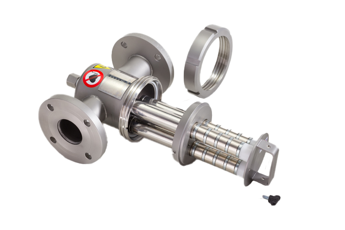 Separator magnetyczny MF – EKO to najprostsza wersja separatora przepływowego MF. Konstrukcja MF – EKO oparta jest na konstrukcji typu MF – Classic, ale jest to wersja uproszczona=. Separator składa się z korpusu, tubusów na kołnierzu, rdzeni magnetycznych oraz elementów podłączeniowych. Tubusy osłonowe, które są na stałe połączone z kołnierzem nośnym, są z jednej strony otwarte, aby można było wyciągnąć rdzenie. Po wyciągnięciu rdzeni magnetycznych z tubusów tubusy zostają rozmagnesowane. Rdzenie są więc całkowicie zakryte tylko, kiedy są umieszczone w tubusach, to znaczy w pozycji separacji.